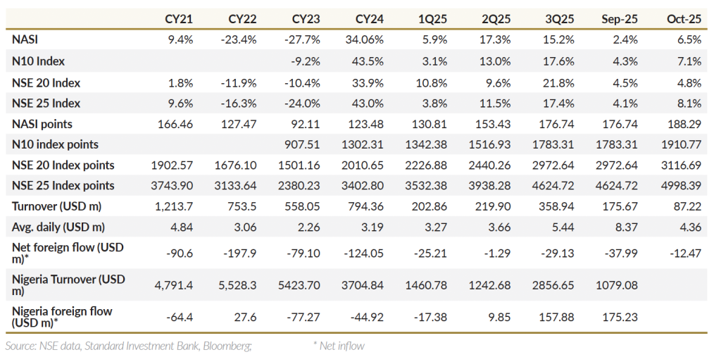 The bourse closed the month of October on a bullish note with the broad market returning +6.5% m/m . Likewise, the N10, NSE 20, and NSE 25 advanced by 7.1% m/m, 4.8% m/m, and 8.1% m/m, respectively – faster growth compared to the prior month.