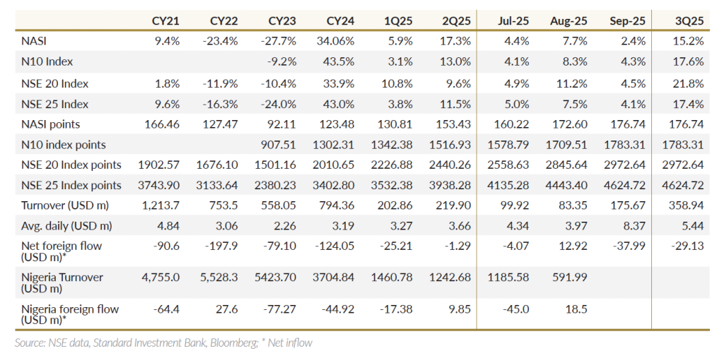 For 3Q25, double-digit capital gains were registered across the benchmark indices with the N10, NSE 20, and NSE 25 outpacing their returns for 2Q25 and 1Q25 in 3Q25 – having advanced by 17.6%q/q, 21.8%q/q, and 17.4%q/q, respectively. The All Share Index, though growing by 15.2% q/q, lagged its 2Q25 growth of 17.3% q/q.