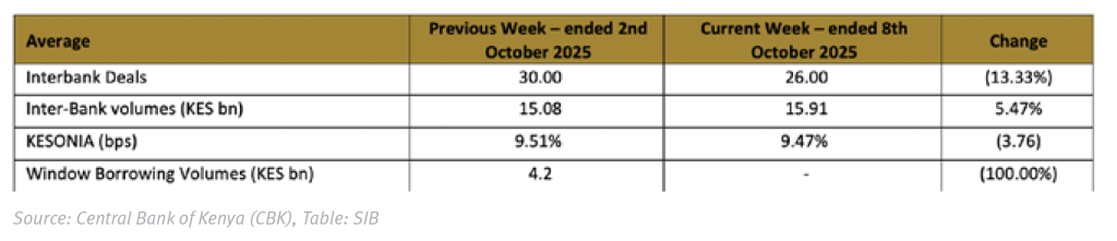 Interbank lending eased during the week, with the average traded volumes inching 5.47% w/w higher to KES 15.91bn, from KES 15.08bn the prior week. The number of interbank deals however reduced by 13.33% w/w. The Kenya Shilling Overnight Interbank Average (KESONIA) tapered by 3.76bps w/w to an average of 9.47%. Notably, no players utilized the CBK borrowing window in the week.