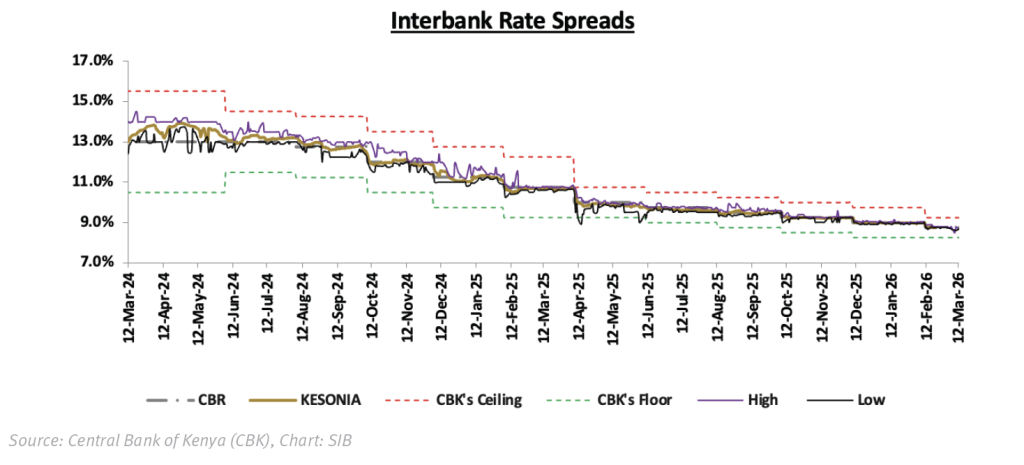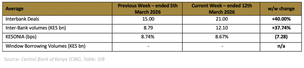 Liquidity conditions remained largely stable in the week, with the Kenya Shilling Overnight Interbank Average (KESONIA) easing by 7.3bps w/w to an average of 8.67%. Interbank lending jumped in the week, with average traded volumes rising by 37.74% w/w to KES 12.10bn, from KES 8.79bn in the prior week. Notably, the average number of interbank deals came in at 21, up 40.0% w/w. Find the summary below: