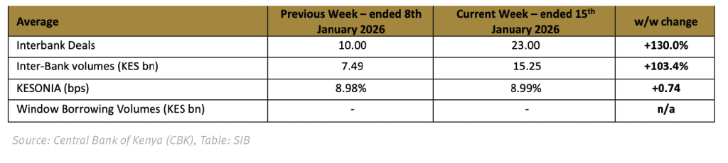 Liquidity conditions remained largely stable in the week, with the Kenya Shilling Overnight Interbank Average (KESONIA) rising by 0.74bps w/w to an average of 8.99%. Interbank lending advanced during the week, with average traded volumes trending higher by 103.4% w/w to KES 15.25bn, from KES 7.49bn in the prior week. The uptick was mirrored by a higher transaction count (+130.0% w/w to 23). Find a summary below: