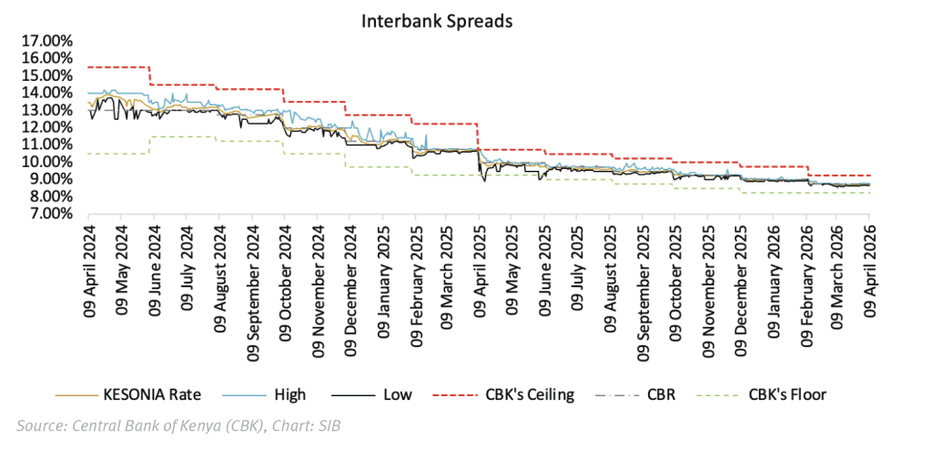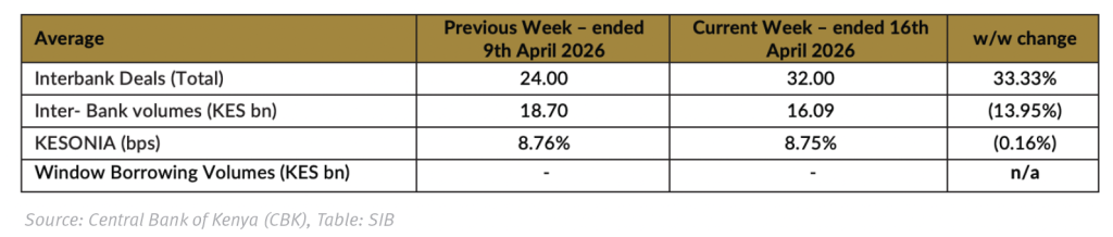 Liquidity conditions remained largely stable in the week, with the Kenya Shilling Overnight Interbank Average (KESONIA) edging up 1.0bps w/w to an average of 8.76%. Interbank lending remained decreased in the week, with average traded volumes at KES 11.20bn. Notably, the average number of interbank deals came in at 21, down 35% w/w. Find the summary below: